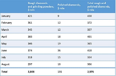 For eight months of 2021, total rough and polished diamond sales accounted for $2,976 million, including $2,844 million of rough diamond sales and $131 million of polished.