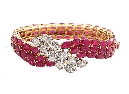 The fascinating jewels is sculpted in aesthetics of blissful motifs encapsulating the charm of amorousness. Each piece is intricately encrusted with the flamboyance of diamonds in rose-cut, round-cut, princess cut and drop-shaped embellishments. Romanticizing the captivating rubies symphonically placed in invisible, alternate and center settings, this collection is a majestic art that mirrors the great work of Shakespeare.