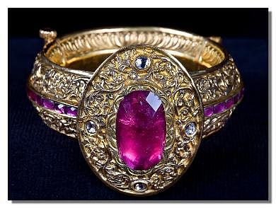 Amongst the pieces are: a ring designed with blue topaz /ruby / diamond set in 18 kt gold, a bracelet of ruby strands with central motif of rubies and polki set in 22 kt gold and silver, bangle bracelet designed with gold repouse inset with polki and rubilite, a gold watch bracelet made with rubilite / polki and pearl central motif.