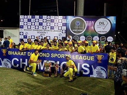BDB XI have been crowned Bharat Diamond Sports Cricket League Champions for 2018 Season 1 after SRKians owned by Shree Ram Krishna Exports lost to them in finals, held on 15th April 2018.