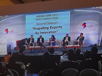 The next panel discussion covered how innovation could be a powerful catalyst for propelling exports. The panel included PN Prasad, DMD, SBI, Bijayananda Pattanayak, Executive Vice Chairman, Induslnd Bank, Russell Mehta, Advisor to Chairman, GJEPC, Sanju Kothari, Convener, BITC, GJEPC and Evgeny Augreev, Director, Alrosa.