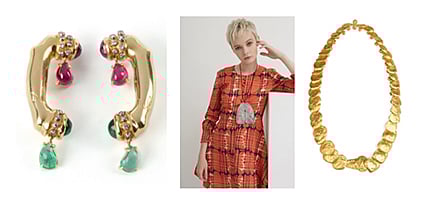 Arman’s playful necklace encapsulates the sense of abandon that artists embraced when crafting wearable sculptures (illustrated, page one). The 19 small gold paint tubes form a classic V-shape around the neck. Harry Bertoia’s hand-hammered gong pendant (illustrated above, centre) echoes the principal exploration of sound that his work is renowned for, whilst simultaneously celebrating a form that appears ancient, and timeless. Bertoia first started making and indeed teaching jewellery while he was head of the metalwork department at the Cranbrook Academy of Art during the Second World War. As metal supplies dwindled during the war, Bertoia started to work out his ideas on a smaller scale, his jewels becoming maquettes with which to organise and develop his ideas. Claude Lalanne’s work has a sinuous, organic form, incorporating flora and fauna in a manner that is reminiscent of Art Nouveau, with a delicate infusion of surrealism and fantasy. The exhibition will include an 18ct gold front fastening necklace that is formed from articulated hydrangea flower petals arranged in a graduated manner (illustrated above, right).