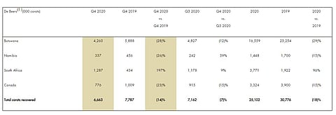 Demand for rough diamonds showed positive trends in the fourth quarter of 2020, and the indications are that encouraging levels of consumer demand for diamond jewellery continued during the holiday season in the US, while China also performed well. Rough diamond sales totalled 6.9 million carats (6.4 million carats on a consolidated basis)(2) from two sights, compared with 6.6 million carats (6.5 million carats on a consolidated basis)(2)from three sights in Q3 2020, and 7.0 million carats (6.6 million carats on a consolidated basis)(2)from two sights in Q4 2019.