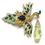 The 96.62-carat diamond, suspended from the bird’s beak, can be detached and worn as a pendant, while the bird’s wings also detach to form a pair of earrings and the tail can be transformed into a brooch. This historic diamond, which is of an extraordinary size for an antique-cut briolette, comes back on the market after 42 years. The jeweller was commissioned to transform the briolette into a bird of paradise with yellow gold, set with yellow and white diamonds, emeralds and a cabochon sapphire.