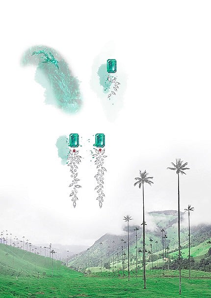 The poetic and romantic designation jardin describes the plant-like shapes found within an emerald. A microscope reveals the fascinating hidden inner world of the gem reveals itself. Spectacular structures within the gem bear witness to its origins and are as unique and individual as a fingerprint. The emerald crystal was formed millions of years ago deep within the earth and these characteristics can provide valuable information about the gemstone’s history as well as its identity, authenticity and origin. Photomicrography of the Colombian emerald (4.97 ct) offers deep insights while celebrating the inner beauty of the gemstone. This combination of knowledge and aesthetics makes it possible to understand, interpret and embody the unique nature of the gemstone. The floral shapes seen within the emerald reminded designers of a Colombian wax palm.