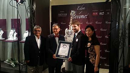 The Launch ceremony of the CORONET® Diamond Guitar and the most valuable guitar - as verified by a GUINNESS WORLD RECORDS adjudicator - was held at CORONET® stand (Hall 1.1 Stand A32) at 12noon on March 20, 2015. The event was jointly officiated by Aaron Shum, President of Aaron Shum Jewelry Group; Alex Wong, General Manager of Chow Tai Fook; Ms Eleonora Dal Pozzo, Entertainment Relations Professional of Gibson Brands and Designer Mark Lui.