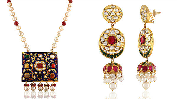 The collection’s design approach centers around a sophisticated and traditional appeal. Thereby, it can be teamed with Indian ethnic attire as well as western wear. The collection incorporates artisanal and finely detailing in its pieces. These intricately crafted traditional earrings feature an interesting mix of multi-coloured gemstones, uncut polki diamonds and meenakari work.