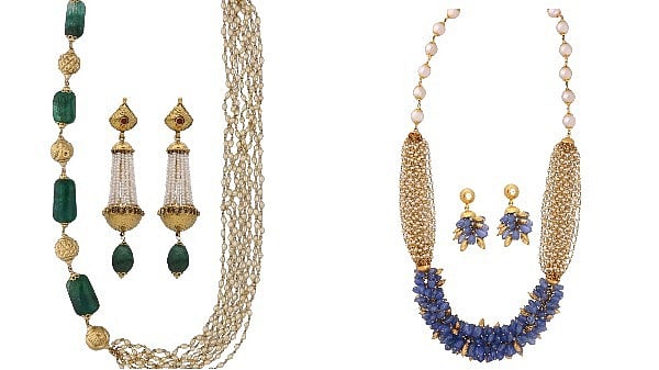 Each bauble is curated in 22K yellow gold with imperial hues of beads chiseled out of semi-precious stones and south sea pearls adding to the traditional essence.