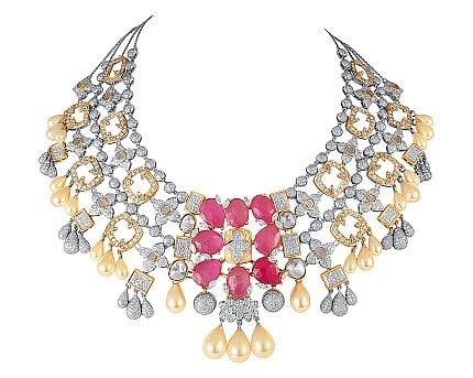 Inspired from elegant motifs like floral, tassel, celestial, abstract, art-deco and vintage chandeliers defined in filigree and nakshi craftsmanship, the mesmerizing collection is an amalgam of eclectic neckpieces and earrings in chained, inter-linked and multi-layered designs with fine-cut diamonds studded symphonically with blue sapphires and other precious gemstones.