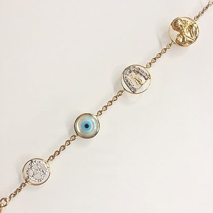 The Multiple Charmed Eye women's faith bracelet is crafted in 18K hallmarked gold and diamonds with a Shivling, Aum , EvilEye , & Sai baba .