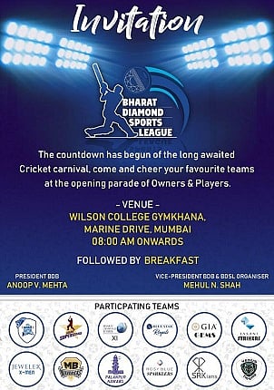 The cricket tournament will feature 12 teams with players from the following companies and organisations taking part include Asian Star, Ankit Gems, Bharat Diamond Bourse, Mahendra Brothers, Blue Star, Palanlur Samaj Kendra, Jewelex, Venus Jewel, Shree Ramkrishna Exports, GIA, Rosy Blue and Jasani.
