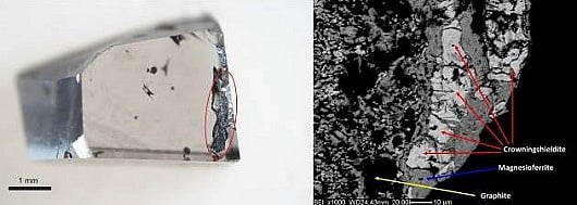 Crowningshieldite was accepted as a mineral on Sept. 18 by the International Mineralogical Association. Smith and his team of researchers discovered crowningshieldite while examining inclusions in CLIPPIR diamonds – a variety of type IIa diamond that forms at significantly greater depths than most diamonds. Crowningshieldite is a nickel sulfide mineral with a hexagonal crystal structure and can be regarded as the high-temperature polymorph of the mineral millerite. It is also the naturally occurring analog to the synthetic compound known as α-NiS. The mineral is proposed to have formed by alteration or chemical modification of originally metallic, polyphasic inclusions. These iron and nickel-rich metallic inclusions are the most prevalent type of inclusion found in CLIPPIR diamonds.