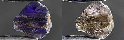 Johnkoivulaite has a hexagonal crystal structure that is very similar to beryl and other members of the beryl group, such as pezzottaite. Standard gemological testing gave an RI of 1.608, with a birefringence too small to accurately measure, an SG of 3.01, a hardness of 7½, a conchoidal fracture, vitreous luster, and no reaction to long-wave or short-wave UV. This mineral is especially unique due to the strong pleochroism it shows from deep violet to nearly colorless when observed with polarized light.