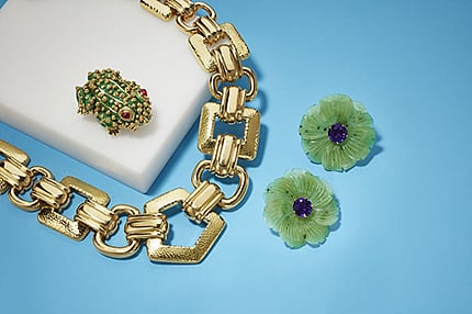 The top lots were by Graff, led by an Emerald and Diamond ‘Icon’ Necklace that sold for $52,500, against a low estimate of $10,000; Emerald and Diamond 'Icon' Earrings, which realized $43,750; and a Ruby and Diamond Ring, that sold for $35,000. Designs by David Webb also commanded top prices including Diamond and Multi-Gem Earrings, which realized $35,000; and a Gold Necklace, that sold for $35,000; both achieving more than four times their estimates. Other notable results included a 'Circle Rope Link' Gold Necklace, by Verdura that achieved $20,000, against a low estimate of $6,000; and a Diamond, Sapphire and Turquoise Bracelet, by Tiffany & Co. that tripled its estimate selling for $15,000.