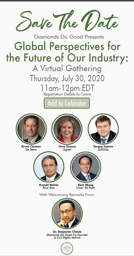 Diamonds Do Good® will convene viewpoints from De Beers’ Bruce Cleaver, Signet’s Gina Drosos, Alrosa’s Sergey Ivanov, Rosy Blue’s Russell Mehta and Chow Tai Fook’s Kent Wong in a live interactive event on July 30th from 11am to noon EDT. Diamonds Do Good co-founder and civil rights advocate Dr. Benjamin Chavis will give opening remarks, along with a special appearance from magician and endurance artist David Blaine.