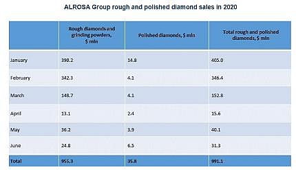 ALROSA Group June 2020 sales of rough and polished diamonds accounted for $31.3 million, including proceeds from rough diamond sales of $24.8 million, and from polished diamond sales of $6.5 million.