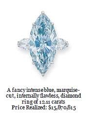 | The top lot for Christie’s Jewels for the year was a fancy intense blue, marquise-cut, internally flawless, diamond ring of 12.11 carats, which sold in Hong Kong in July for $15,870,815. In the November Geneva Magnificent Jewels sale, a new auction record price per carat was established for a fancy purplish-red diamond, set into a ring by Graff. The 1.05 carat stone sold for CHF2,760,000, translating into price per carat at $2,640,000. |