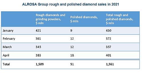 ALROSA sales of rough and polished diamonds in April totaled $401 million, including proceeds from rough diamond sales of $383 million, and polished diamond sales of $18 million.