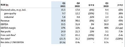 ALROSA’s Q1 sales totalled 15.5 m cts, up 65% y-o-y and 47% more than in Q1'19, delivering robust financial results for the quarter, with RUB 91 bn in revenue and a 5% y-o-y growth in EBITDA which came at RUB 33.5 bn. Impressive sales volumes, which were more than twice as high as production, and a seasonal decrease in capex translated into a 2.4x growth in Free Cash Flow toRUB 52.7 bn, record-high for this period.