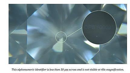 In contrast, a Loupe ID is larger and denser and can be used in strategic places, such as the centre of the table, to allow valuers, grading houses and consumers to quickly distinguish laboratory-grown or branded items from natural diamonds. This group of identifiers is so named because of their visibility using a standard 10x loupe and can be placed at depths of up to 0.25 millimetres (250 microns) beneath the surface of a diamond.