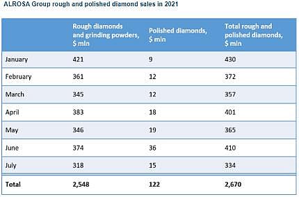 For seven months of 2021, total rough and polished diamond sales accounted for $2,670 million, including $2,548 million of rough diamond sales and $122 million of polished.