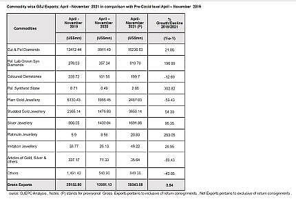 The overall gem and jewellery exports for November 2021 witnessed a decline of 7.65% to US$ 2384.95 million (declined 3.72 % in rupee terms to Rs. 17784.92 Crore) as compared to US$ 2582.39 million (Rs. 18471.31 Crore) in November 2019. The decline was expected due to break in manufacturing activity during Diwali.