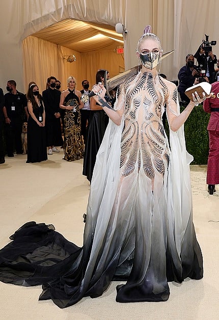 Explaining that each piece in the auction "offers a unique interpretation of the theme 'resistance,'" Grimes donated a whimsical pair of earcuffs, designed by Romantic Elf Jewelry, and chrome CHRISHABANA x Dune Harkonnen face mask. The experimental musician wore the pieces to the 2021 Met Gala back in September, along with a sheer Iris Van Herpen gown, for the event's "In America: A Lexicon of Fashion" theme. Her look—which was inspired by the 1984 cult classic Dune (and subsequent 2021 remake) based on Frank Herbert's novel—also included a replica Medieval sword repurposed from an Colt AR-15A3. The weapon, however, is not up for auction, as its "a permanent piece" of the Metropolitan Museum of Art's collection. All proceeds from the auction will go to non-profit organizations Diaspora Relief and Razom for Ukraine, which will use the funds to provide food, shelter, and evacuation support to those in need, the "Genesis" singer explained. Bidding is open exclusively on Artsy and will start closing on May 26.