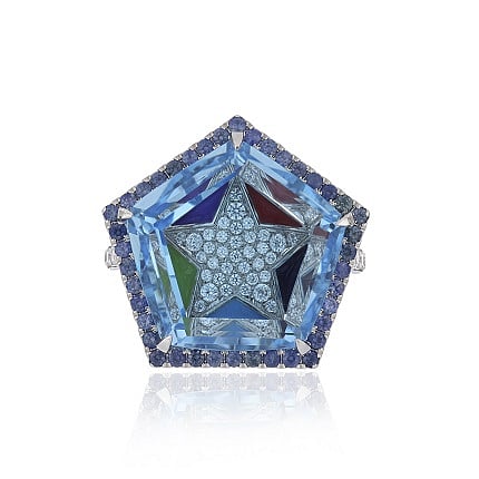 The Star Topaz and Secret Diamond Ring highlights a star, made of white diamonds, shining through a pentagon-shaped green blue topaz center stone, which is tiger-prong set and surrounded by a halo of sapphires. It has white diamonds across the band, set in 14K white gold. The bright color and eccentric design are the ultimate nod to the power, strength, and beauty women have within. From our world, one looks up at the stars, but metaphorically women are rockstars, and this ring celebrates that.