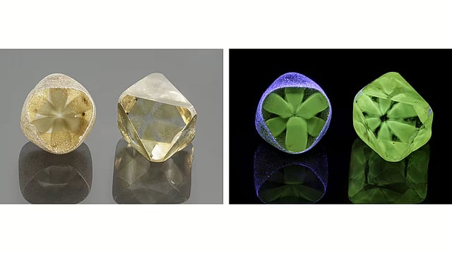 The 8.57-carat diamond, in contrast, was polished with bruted edges, but still maintained its characteristic star-shaped inclusion. Both diamonds have undergone a process called resorption, where natural fluids or magma partially dissolve the stone, leading to a rounded shape. Despite this process, the diamonds preserved much of their original form.
