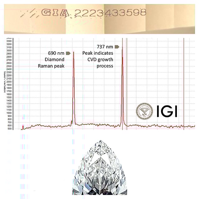 The International Gemological Institute (IGI), the world’s largest independent gemological laboratory, recently analyzed a 6.01 carat pear-cut gemstone with a laser inscription corresponding to a natural diamond, but concluded it was laboratory grown. Submitted to IGI’s Tel Aviv location for verification, the lab grown stone’s carat weight, physical spread, and primary qualities were a close match with the natural diamond’s online data.