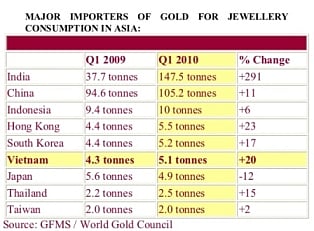 The Vietnamese gold and jewellery market value is around US$6.36 billion in 2008, and growing rapidly, According to figures compiled by GFMS for World Gold Council, it is the 6th largest consumer of gold and jewellery in Asian region.