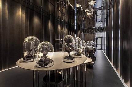 To showcase its collection of lab-grown diamond jewelry pieces, Âme engaged architecture studio Baranowitz + Kronenberg (B+K) to design the flagship store. Here, customers take a journey of exploration through rolled stainless steel curtained walls and suspended vertical rods. Each piece of jewelry is separately displayed beneath a sleek glass cloche on dark, polished concrete. The core concept of the Âme boutique is the consolidation of the past, present, and future, merging the historic architecture of New York City with a radical contemporary design. The boutique’s steel walls represent the shadows cast from undulating cast-iron facades found around the Lower Manhattan neighborhood. The duality of the historic architecture and cutting-edge modern reflects the very soul of Âme. Scent is also used to enhance the sensory experience, with an earthy and smoky fragrance, custom-made by British perfumer Azzi Glasser, wafting throughout the store. |