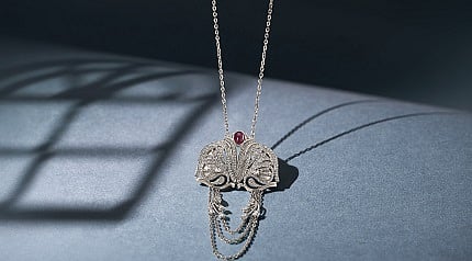 Libera’s ‘Unchained Elegance’ showcases an emerald stone surrounded by rose cut and brilliant round diamonds. Flawless, eternal and with just a fission of mystery, this statement necklace is an elegant nod to a woman who is happy to be herself. Another unique piece mirrors the movements of a dancer unfurling the drapes of her dress, as though emerging from a cocoon. Intricate workmanship shows a butterfly pendant that holds an oval ruby cabochon in a frame enhanced with luminous mother of pearl and dangling chains. It is aptly titled‘On Wings of Beauty’ for the woman who doesn’t need wings to fly.Mirroring the secret chambers of an art nouveau theatre,‘AFlow of Light’isa pair of chandelier earrings with surreal and detailed accents that lend grandeur to the milieu. A mother-of-pearl of spectacular rarity isembraced by diamonds and ebbs down to a drop-shaped emerald suspended as if in space flowing into rivers of shimmering rose-cut diamonds.