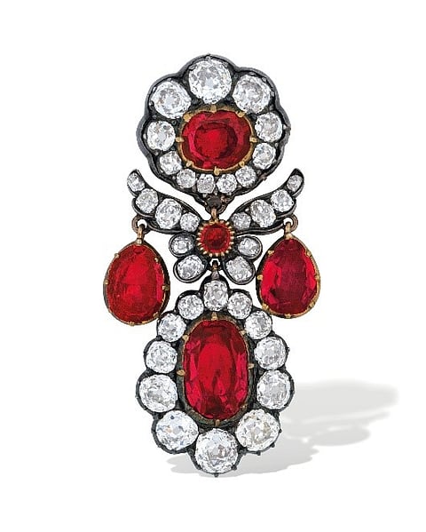 In 1810 Napoleon commissioned the jeweller François-Régnault Nitot, precursor of Chaumet, to create a ruby and diamond parure for the French Crown Jewels. The parure contained 404 rubies and 9,430 small diamonds. Under the Bourbon Restauration, one of the first decisions was to reset all Napoleon’s jewels starting with the ruby suite, even though it was only five years old. In 1816, court-jeweler Paul-Nicolas Ménière remounted the ruby and diamond parure. The Third Republic did not know what to do with the crown jewels, such a symbol of royalty and in 1887, they were sold at auction held in the Louvre. Boin-Taburet acquired the ruby and diamond earrings together with their matching pendant. At some later date one of the earrings must have been converted into the brooch we see today (estimate CHF40,000-60,000).