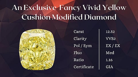 Adding an extraordinary touch to the collection will be an exclusive 12.52 ct Cushion Modified Solitaire, in Fancy Vivid Yellow hue & VVS2 clarity. This diamond is more than just beautiful. It’s a true marvel that transcends the traditional 4C’s with exceptional polish, perfect symmetry & breathtaking brilliance - an undeniable showstopper.