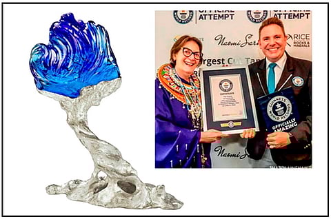 Named "L'Heure Bleu," this extraordinary tanzanite sculpture weighs an impressive 703.4 carats and was meticulously crafted by New York-based artist Naomi Sarna. Mounted on a sterling silver base with an elegant twist, L'Heure Bleu stands as a testament to both artistic skill and the rarity of this gemstone.